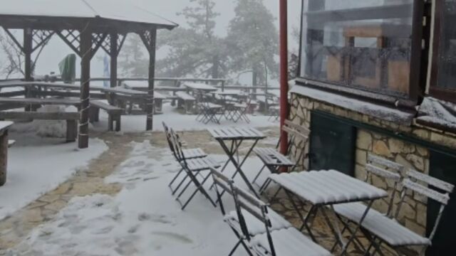 Μια λεπτή στρώση χιονιού καλύπτει τις περισσότερες επιφάνειες της Πάρνηθας, με τα καταφύγια Μπάφι και Φλαμπούρι να είναι ανοικτά