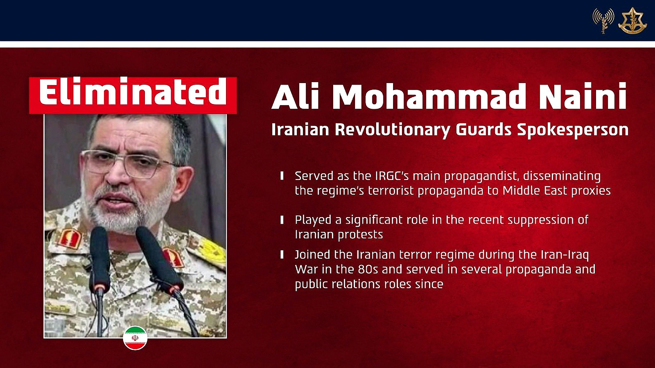 As Forças de Defesa de Israel (FDI) confirmaram nesta sexta-feira, 20, que Ali Mohammad Naini, porta-voz da Guarda Revolucionária Islâmica do Irã (IRGC), foi eliminado em um ataque aéreo. O ataque foi realizado durante a noite pela Força Aérea israelense, com base em informações da Diretoria de Inteligência Militar “Ao longo dos anos, Naini ocupou diversos... The post Crusoé: Porta-voz da Guarda Revolucionária do Irã é eliminado appeared first on O Antagonista .