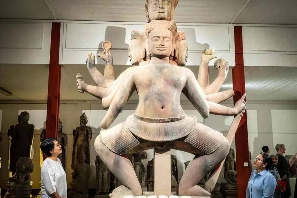 柬埔寨一尊高达5米、重约7吨、曾碎成逾1万块的巨型湿婆神雕像,历经逾五年修复后重现千年风采。