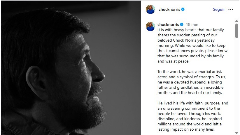 Chuck Norris Reprodução/Instagram A morte do ator americano Chuck Norris provocou forte repercussão nas redes sociais nesta sexta-feira (20). “Uau. Sinto muito por ouvir isto. Ele sempre foi tão gentil e caloroso. Uma verdadeira lenda em uma câmera e fora da câmera", escreveu o ator americano Mike Colter. Baixe o app do g1 para ver notícias em tempo real e de graça O ator e artista marcial Chuck Norris morreu aos 86 anos. A informação foi confirmada nesta sexta-feira (20), pela família nas redes sociai do ator. Ele havia sido levado a um hospital após uma emergência médica registrada nesta semana na ilha de Kauai, no Havaí, ainda segundo o portal. Ainda não há informações sobre a natureza do problema de saúde que o levou ao hospital. Segundo o site a situação aconteceu de forma repentina. Na quarta-feira, Norris ainda treinava normalmente na ilha. Um amigo chegou a falar com ele por telefone no mesmo dia e disse que o ator estava bem disposto e até fazendo piadas. Norris comemorou recentemente o aniversário. Para marcar a data, publicou nas redes sociais um vídeo em que aparece treinando com um instrutor. Veja os vídeos em alta do g1 Veja os vídeos que estão em alta no g1