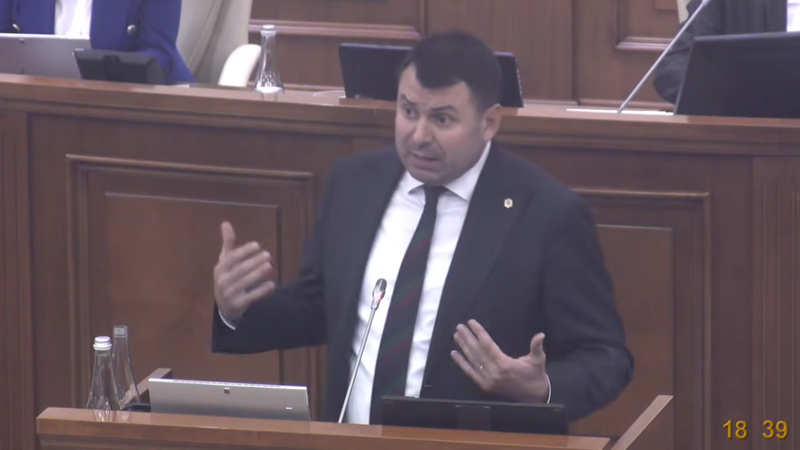 (stop cadru) Costiuc, după discursul lui Popșoi în plen: Dacă pe ministru îl dezbraci din hainele galbene, e în chiloți roșii cu secera și ciocanul