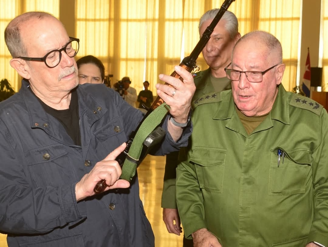 Silvio Rodríguez recibe fusil AKM en presencia de Miguel Díaz-Canel
