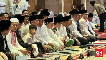 Wapres RI Gibran Rakabuming dan putranya Jan Ethes melaksanakan salat Idulfitri di Masjid Istiqlal Jakarta pada Sabtu (21/3) pagi.
