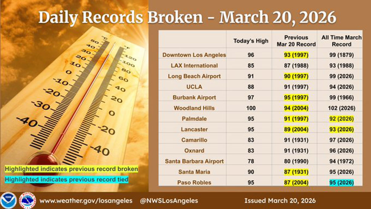 Στο Παλμ Σπρινγκς, ανατολικά του Λος Άντζελες, καταγράφηκε μέγιστη θερμοκρασία 41,5°C και στη λίμνη Μαρτίνεθ 43°C