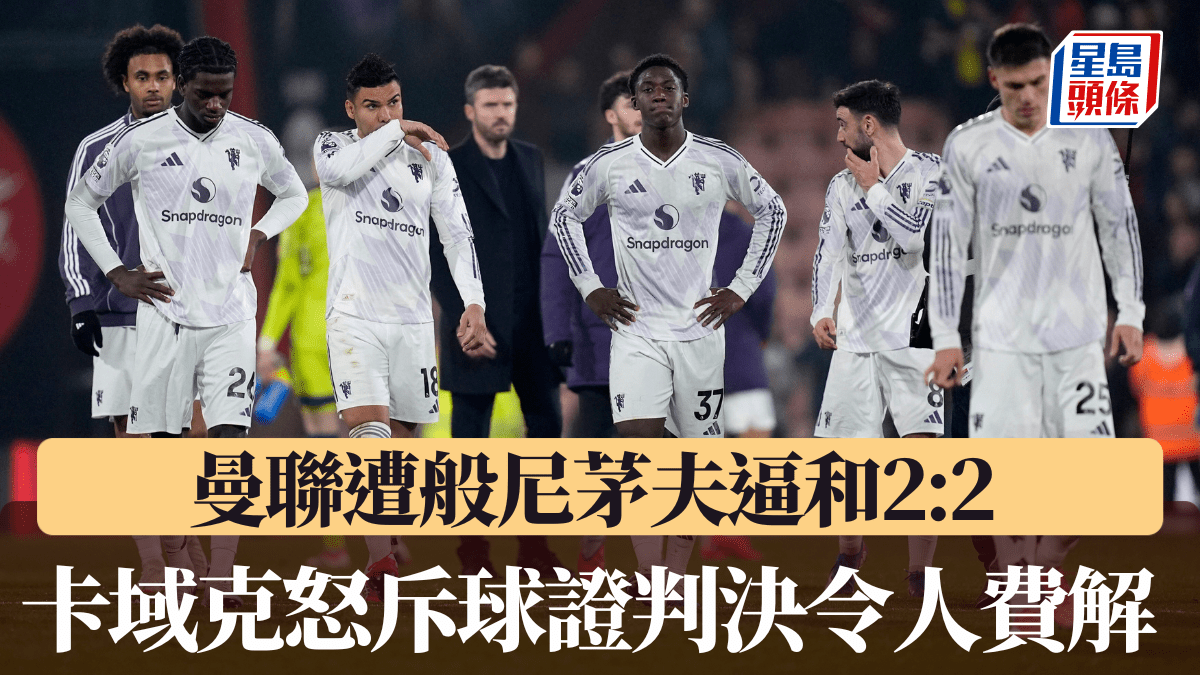曼聯在週六晚的英超聯賽中,作客般尼茅夫,在一場充滿爭議的比賽中被逼和2:2,爭奪下屆歐聯資格之路再遇阻滯。賽後,曼聯看守領隊卡域克(Michael Carrick)對球證艾維爾(Stuart Attwell)的判決大感不滿,直斥其決定「令人費解」及「驚人」。 兩次相似犯規 不同判決惹爭議 今場比賽的爭議焦點,主要圍繞在下半場的兩次十二碼判決。比賽第61分鐘,般奴費南迪斯(Bruno Fernand