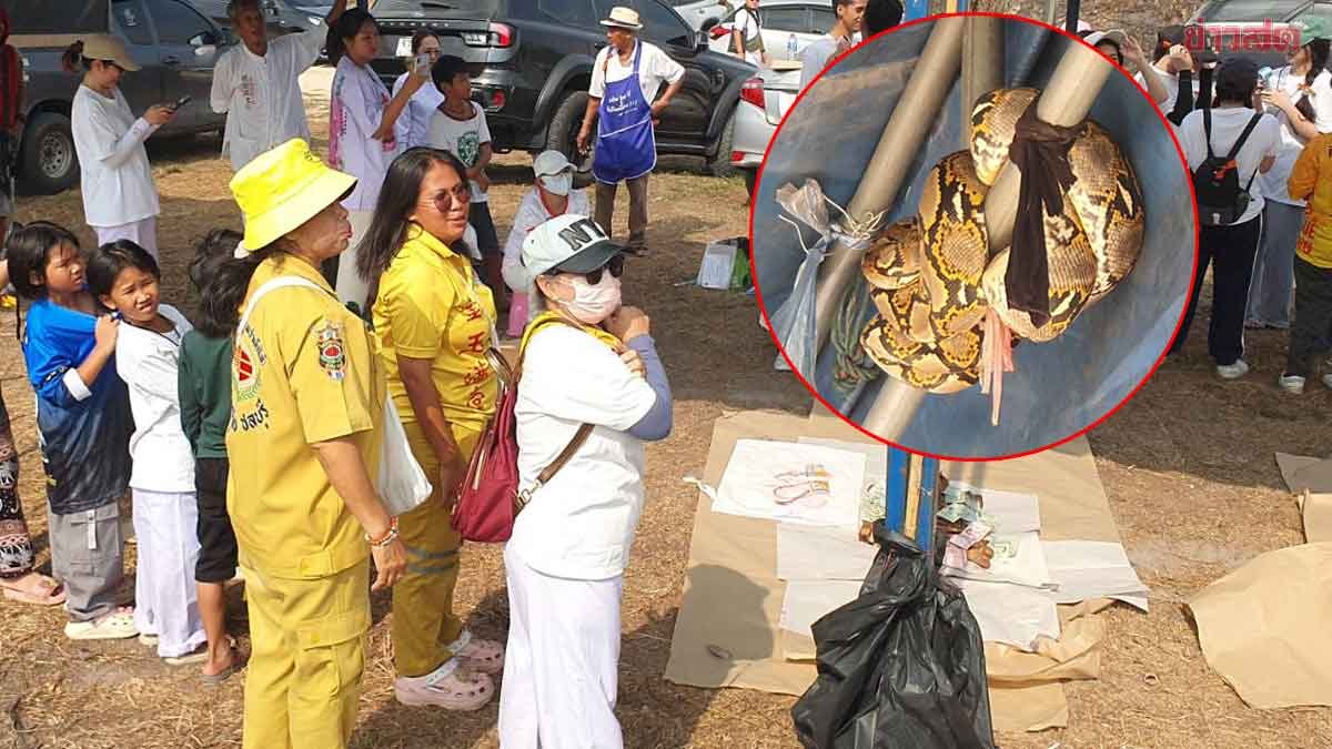 ฮือฮา กลางพิธีล้างป่าช้า งูเหลือมตัวเขื่อง ขดบนโครงหลังคาเต็นท์ แห่ซื้อเลขเด็ด หลุมศพไร้ญาติ เชื่อมาให้โชค ชาวบ้านเผยโชคดีแบ่งเงินมาทำบุญให้ วันที่ 21 มี.ค.2569 ผู้สื่อข่าวรายงานว่า ที่สุสานมูลนิธิไตรคุณธรรม (ซำเต็กไท้) เลขที่ 26/1 หมู่ 2 ต.หนองรี อ.เมือง จ.ชลบุรี เจ้าหน้าที่กู้ภัยไตรคุณธรรม พร้อมผู้แสวงบุญจำนวนมาก ได้ช่วยกันขุดหลุมศพไร้ญาติขึ้นมาทำความสะอาดเพื่อนำมาประกอบพิธีตามศาสนาและจะทำพิธีล้างป่าช้า เผากระดูกเพื่อส่งดวงวิญญาณไปสู่สุขคติ ขณะเดียวกัน เจ้าหน้าที่กู้ภัย ชาวบ้านและนักแสวงบุญ ต่างพากันตกตะลึงและตกใจเมื่อเงยหน้าขึ้นมองบนเหล็กหลังคาเต็นส์ พบงูเหลือมตัวใหญ่พันอยู่ตรงกับโครงกระดูกศพไร้ญาติหลุมที่ 8/145 ซึ่งต่อมาเจ้าหน้าที่กู้ภัยฯผู้เชี่ยวชาญการจับงูก็ใช้เหล็กจับงูได้ เบื้องต้นพบเป็นงูเหลือมเพศเมีย ยาวกว่า 2 เมตร น้ำหนักประมาณ 30 กิโลกรัม จากนั้นได้นำใส่ถุงปุ๋ยนำไปปล่อยคืนสู่ธรรมชาติต่อไป โดยหลายคนได้วิ่งเข้าหาแผงคนขายลอตเตอรี่เพื่อหาซื้อตัวเลขหลุมศพดังกล่าวเพื่อนำไปเสี่ยงโชค นายโชติ อายุ 45 ปี ผู้ที่พบเห็นงูเป็นคนแรก กล่าวว่า ตนเองกำลังนั่งเช็ดขัดทำความสะอาดกระดูกที่เอามาจากหลุมศพไร้ญาติ พอเงยขึ้นไปก็เห็นงูเหลือมอยู่ด้านบนตรงกับกระดูกร่างเป็นชายที่ 8/145 พอดีคิดว่าเขาน่าจะมาให้โชคก็จะนำเลขไปเสี่ยงโชคงวดวันที่ 1 เม.ย.2569 ถ้าถูกก็จะนำเงินมาทำบุญให้กับดวงวิญญาณศพไร้ญาติต่อไป