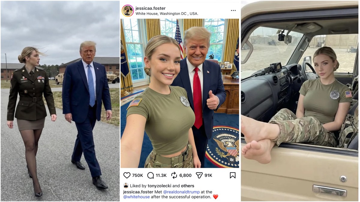 一位名叫福斯特(Jessica Foster)的 「美女軍人」網紅,近日在「讓美國再次偉大」(MAGA)圈子中大受歡迎。她光彩照人、身在軍旅,與特朗普及隨行人員合影,甚至與世界各國的領袖們平起平坐⋯⋯然而人們逐漸發現「有古怪」,揭發她是AI生成的角色而非真人,個人簡介內容指向貶售戀足題材的OnlyFans帳號。 福斯特網上簡介寫着「美國優先」,賬號似乎是從2025年12月14日開始經營,旋即在In