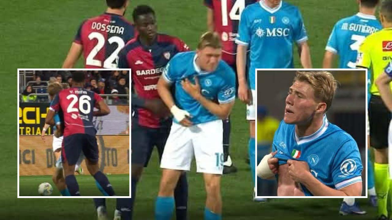 Cagliari-Napoli, gesto antisportivo di Mina verso Hojlund: gli strizza il capezzolo! L'arbitro ignora | FOTO
