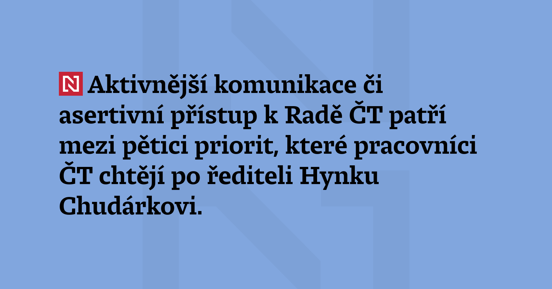 Aktivnější komunikace či asertivní přístup k Radě ČT patří mezi pětici priorit, které pracovníci ČT chtějí po řediteli Hynku Chudárkovi. „Jejich naplňování považujeme za zásadní pro osud veřejnoprávní instituce,“ informovali autoři výzvy.