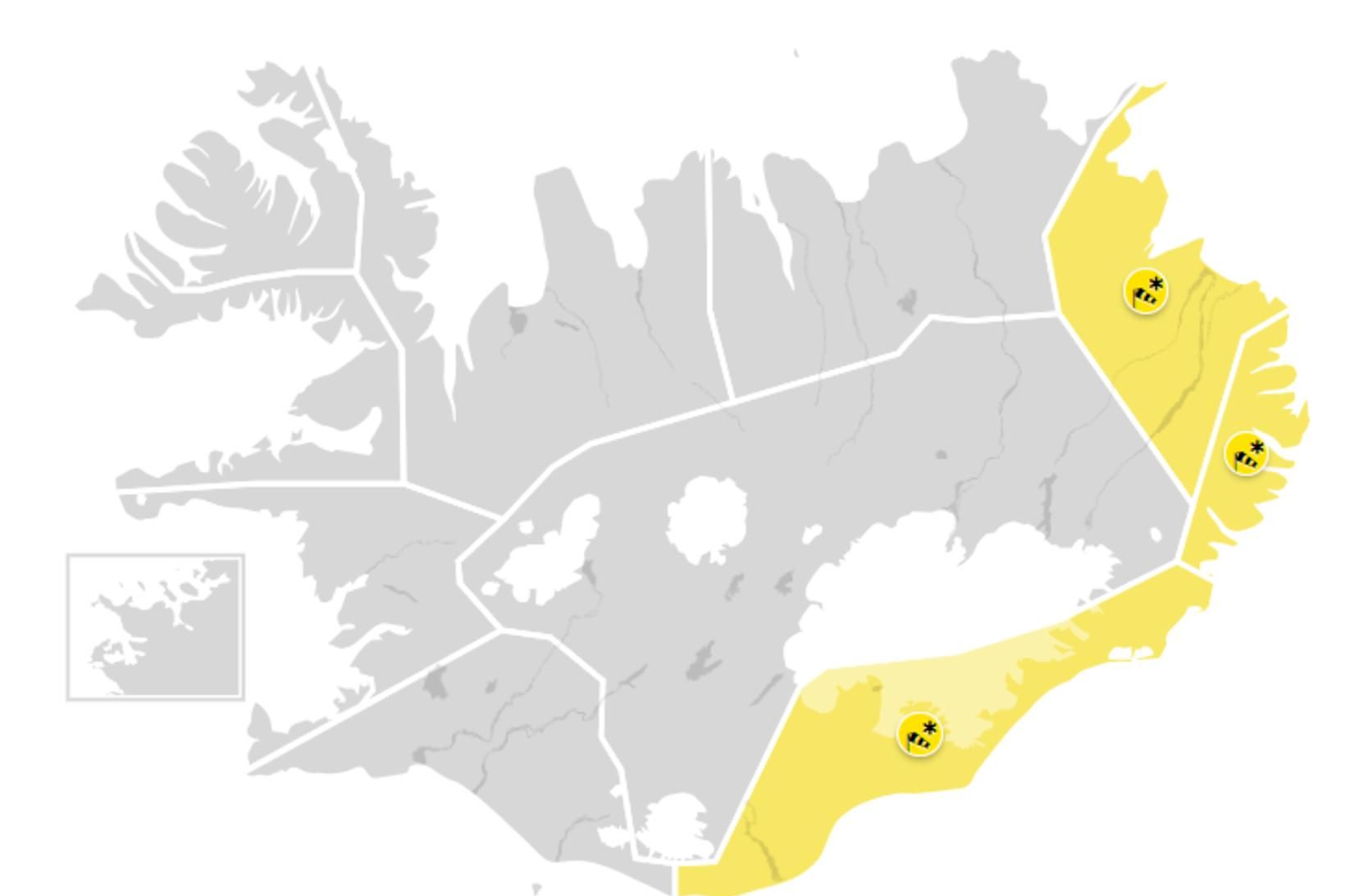 Gul viðvörun gengur í gildi á Austurlandi að Glettingi, Austfjörðum og Suðausturlandi á miðnætti vegna hríðarveðurs.