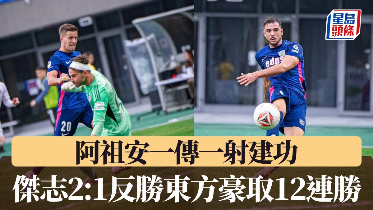 「中銀人壽香港超級聯賽」周六(21日)於將軍澳運動場爆發重頭戲,榜首傑志擺下擂台陣迎戰宿敵東方,合演本周焦點「雙藍會」。在這場充滿張力的激戰中,主隊傑志雖在半場先失一球,但下半場憑藉後備奇兵阿祖安交出一入球一助攻,聯同利安度的建功,最終以2:1反勝東方,將聯賽連勝走勢改寫至12場。 大久保優食詐胡 東方半場領先 甫開賽傑志即採取主動,開賽僅兩分鐘,鄭展龍右路傳中,利安度回後予伊拿拉文迪殺入禁區勁射