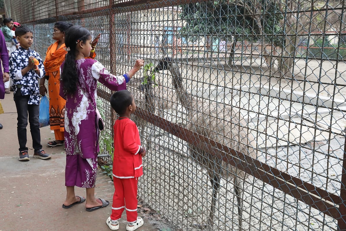 জাতীয় চিড়িয়াখানায় আজ ঢাকা ও এর আশপাশের জেলা থেকে দর্শনার্থীরা এসেছেন। দর্শনার্থীদের কেউ কেউ এসেছেন পরিবার নিয়ে।