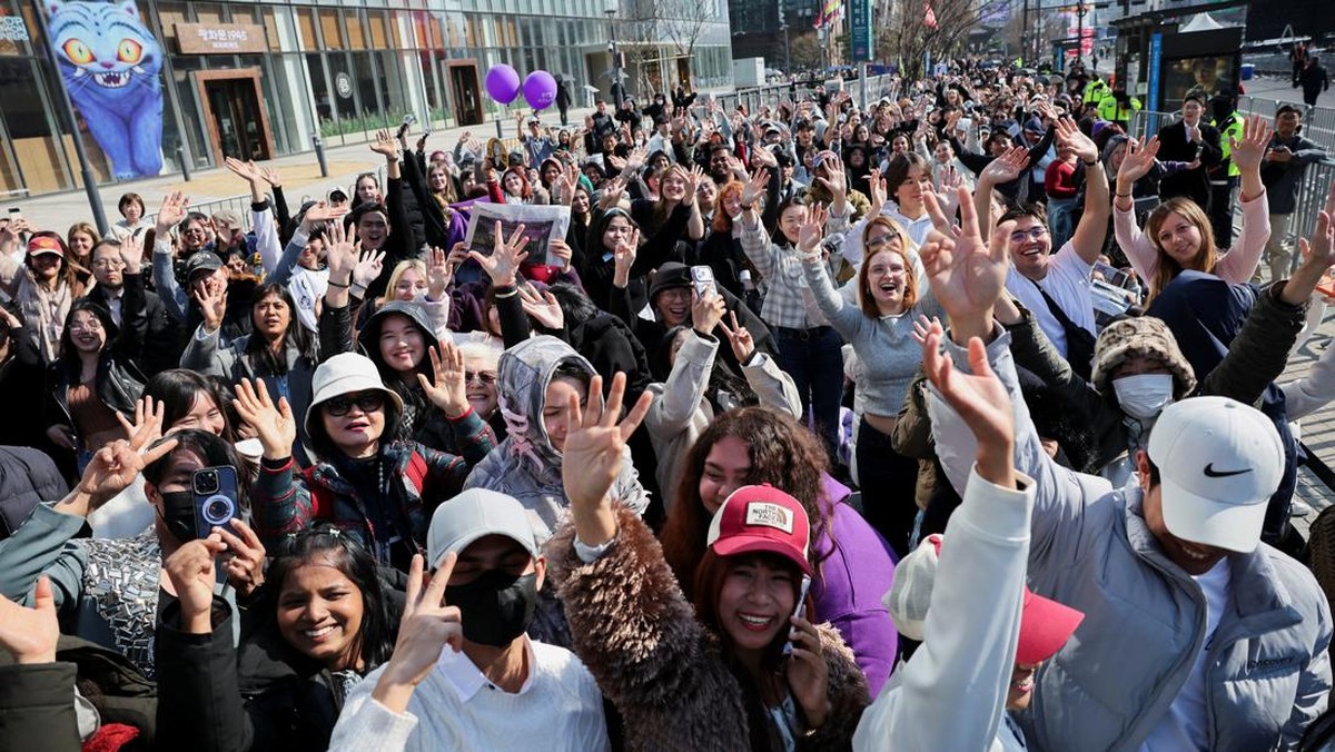 Penggemar padati Lapangan Gwanghwamun Seoul sambut konser comeback BTS. Ribuan personel dikerahkan untuk amankan acara dan antisipasi lonjakan massa.