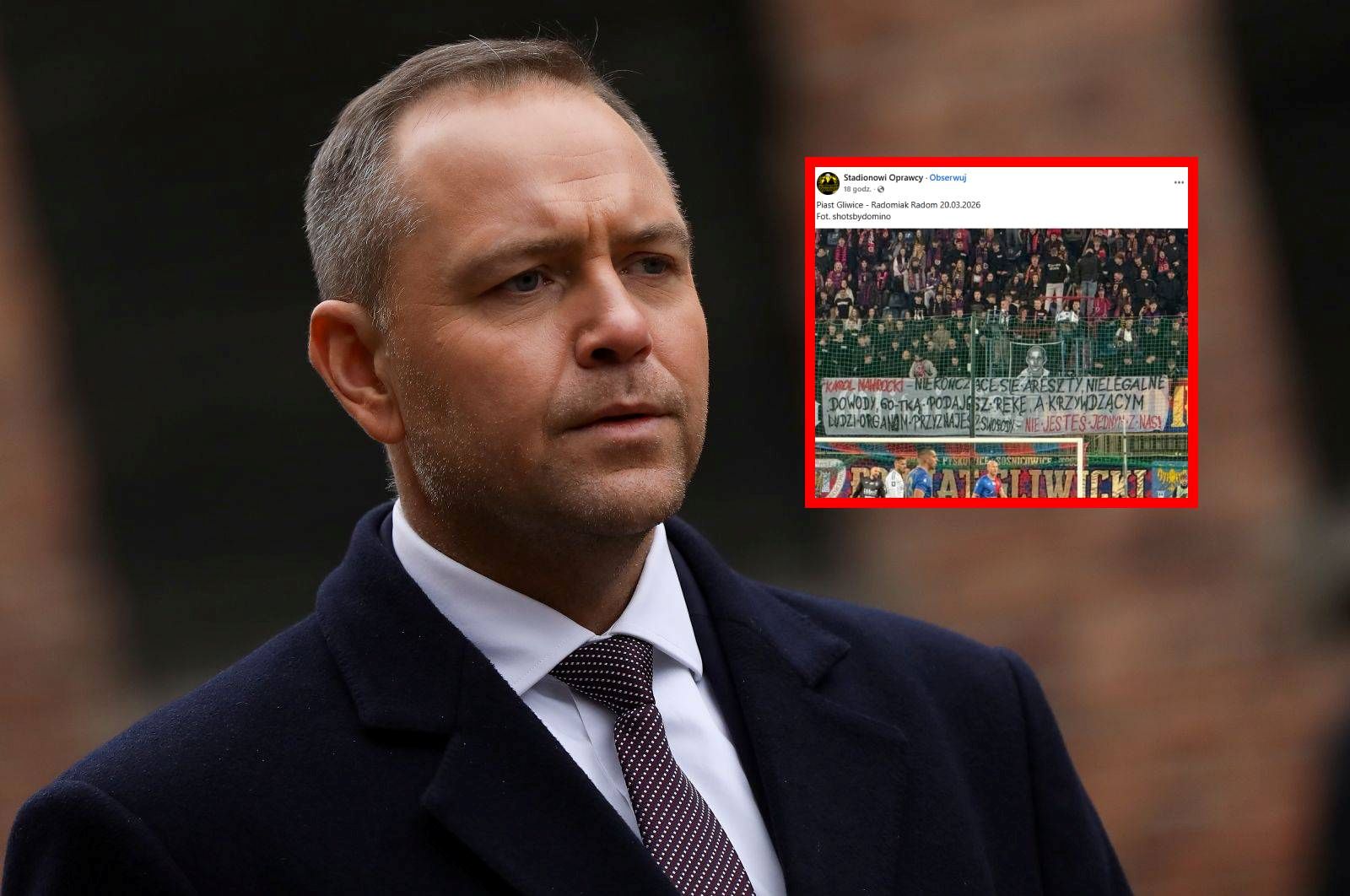 Podczas piątkowego meczu między Piastem Gliwice a Radomiakiem Radom kibice gospodarzy wywiesili transparent krytykujący Karola Nawrockiego. - Został wniesiony na stadion bez zgody klubu - mówił nam rzecznik prasowy Kajetan Piotrowski.