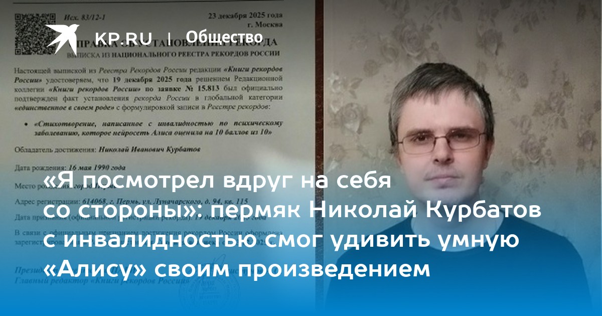 «Я посмотрел вдруг на себя со стороны»: пермяк Николай Курбатов с инвалидностью смог удивить умную «Алису» своим произведением