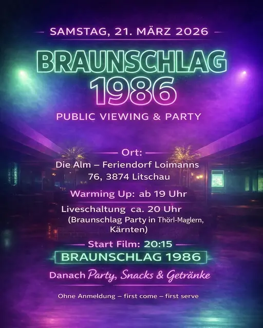 Es ist soweit: Das Waldviertel steht kurz vor einem historischen Ausnahmezustand – und nein, es geht nicht um eine Gemeinderatssitzung, sondern um die Premiere von „Braunschlag 1986“. Ein filmisches Ereignis, das irgendwo zwischen Dorfgasthaus, politischem Grenzbereich und einer dezenten Partywolke angesiedelt ist. Und wo erlebt man dieses Meisterwerk stilecht? Natürlich dort, wo selbst die Realität manchmal nach Drehbuch klingt: Beim großen Braunschlag-Public Viewing am 21. März 2026 ab 19...