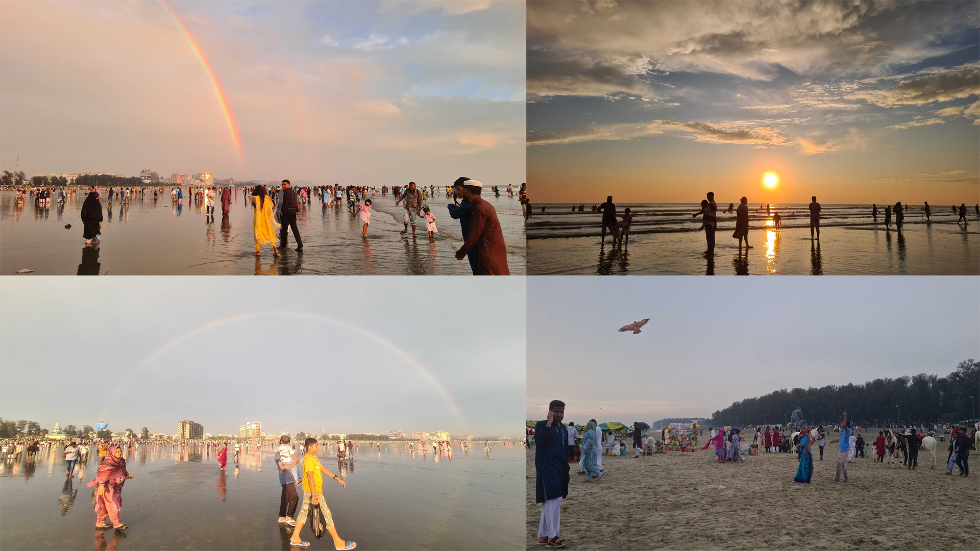চিরচেনা রূপে ফিরছে বিশ্বের দীর্ঘতম সমুদ্রসৈকত কক্সবাজার। পবিত্র রমজানজুড়ে পর্যটকের খরা কাটিয়ে ঈদের ছুটিতে আবারও প্রাণ ফিরে পেয়েছে সাগরপাড়।শনিবার (২১ মার্চ) বিকেলে গুড়ি গুড়ি বৃষ্টির মধ্যেও কক্সবাজার সমুদ্রসৈকতে ভিড় করেন পর্যটক ও স্থানীয় দর্শনার্থীরা। বিশেষ করে সৈকতের আকাশে দীর্ঘ সময় ধরে ভেসে থাকা রংধনু, মেঘ সরে যাওয়ার পর দিনের শেষ বেলার মনোমুগ্ধকর সূর্যাস্ত আর ঠান্ডা হিমেল হাওয়া-সব মিলিয়ে বাড়িয়ে দিচ্ছে পর্যটকদের ঈদ আনন্দ।এদিকে, পর্যটকদের নিরাপত্তা নিশ্চিত করতে সার্বক্ষণিক সজাগ রয়েছে ট্যুরিস্ট পুলিশ।রমজানের একমাস যেন নিস্তব্ধ ছিল সাগরপাড়। তবে ঈদের ছুটি শুরু হতেই আবারও প্রাণচাঞ্চল্যে ভরে উঠেছে কক্সবাজার সমুদ্রসৈকত। সকালে কয়েক দফা গুঁড়ি গুঁড়ি বৃষ্টি হলেও তা সকাল ১০টার মধ্যে বন্ধ হয়ে যায়। কিন্তু বিকেলে ফের গুঁড়ি গুঁড়ি বৃষ্টি শুরু হয়। কিন্তু সেই বৃষ্টিকে উপেক্ষা করেই সমুদ্রের টানে ছুটে আসছেন হাজারো মানুষ। কেউ হাঁটছেন ভেজা বালুচরে, কেউবা উপভোগ করছেন ঢেউয়ের ছোঁয়া।প্রকৃতির অপার সৌন্দর্য আর ঈদের আনন্দ-দুই মিলিয়ে পর্যটকদের ভিড়ে মুখর এখন কক্সবাজার সমুদ্রসৈকত। সময় যত গড়ায়, ততই বাড়তে থাকে মানুষের সমাগম।ঢাকার মতিঝিল থেকে আসা পর্যটক রোকসানা রহমান বলেন, ‘পরিবারকে নিয়ে-আম্মু, বোন আর ভাগ্নিকে সঙ্গে নিয়ে এই প্রথমবার কক্সবাজারে এসেছি। তাই আনন্দটা যেন দ্বিগুণ হয়ে গেছে। আজ আমাদের দ্বিতীয় দিন, সামনে আরও এক সপ্তাহ সময় আছে। আশা করছি, এই সময়টাতে সব জায়গা ঘুরে আরও বেশি উপভোগ করতে পারবো, ইনশাআল্লাহ।’আরও পড়ুন: ঈদের সকালেই কক্সবাজারে গুড়ি গুড়ি বৃষ্টি, কেমন থাকবে দিনের আবহাওয়া?ইব্রাহিম কাদের বলেন, ‘শুক্রবারই আমরা কক্সবাজারে এসেছি। এখন ঈদের ছুটি, তাই এখানে এসে বেশ উপভোগ করছি। বৃষ্টি একটু সমস্যা হলেও আমরা ঠিকই ঘুরে বেড়াচ্ছি। সব মিলিয়ে সময়টা ভালোই কাটছে। দীর্ঘ ছুটির কারণে কক্সবাজারে আসাটা সত্যিই ভালো সিদ্ধান্ত হয়েছে।’স্থানীয় দর্শনার্থী রফিকুল ইসলাম বলেন, ‘বন্ধুদের নিয়ে কক্সবাজারে এসে বেশ ভালোই সময় কাটছে। আবহাওয়া একটু খারাপ-মানে হালকা বৃষ্টি হচ্ছে, তবে খুব বেশি না। বাতাসটা দারুণ লাগছে। সমুদ্রপাড়ে দাঁড়িয়ে খুব ভালো লাগছে। রমজানে এখানে মানুষ অনেক কম ছিল, এখন ঈদের ছুটিতে ভিড় বেড়েছে। বৃষ্টিটাও এমন না যে ঘোরাফেরা করা যাবে না-সব মিলিয়ে উপভোগ করছি।’প্রকৃতিও যেন ঈদের আনন্দে সাজিয়েছে নিজেকে। আকাশজুড়ে দীর্ঘসময় ধরে ভেসে থাকা রংধনু, আর মেঘ কেটে যাওয়ার পর দিগন্তজোড়া সূর্যাস্ত মুগ্ধ করছে দর্শনার্থীদের। শুধু প্রকৃতির সৌন্দর্যই নয়, ঠান্ডা হিমেল বাতাস আর নির্মল পরিবেশ পর্যটকদের দিচ্ছে স্বস