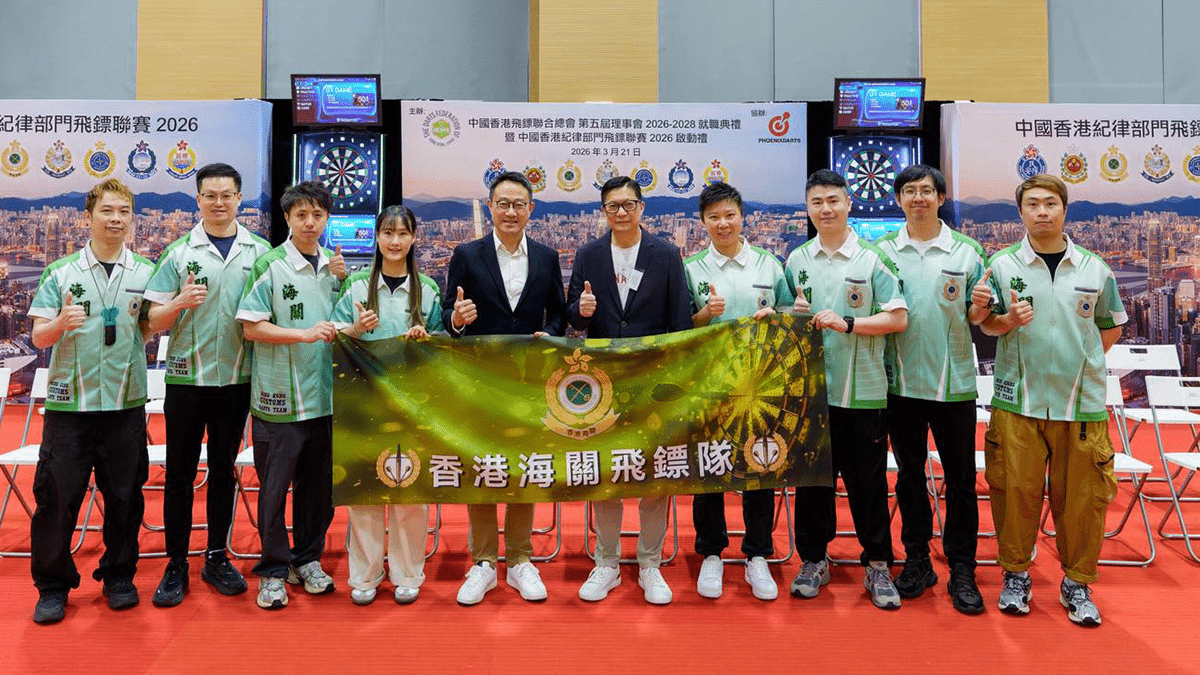 海關關長陳子達今日(21日)出席由中國香港飛鏢聯合總會舉辦的「紀律部門飛鏢聯賽 2026 啟動禮」,與主禮嘉賓保安局局長鄧炳強及各紀律部門首長一同主持啟動儀式,瞄準擲出富凝聚力的一鏢,象徵各紀律部隊的高度團結性及專注度,為30名隊員注射一枝強心針。 海關飛鏢隊與鄧炳強及陳子達拍照留念後參加比賽,與醫療輔助隊的飛鏢隊展開第一場對決,最終不負眾望,成功奪得首場勝仗。