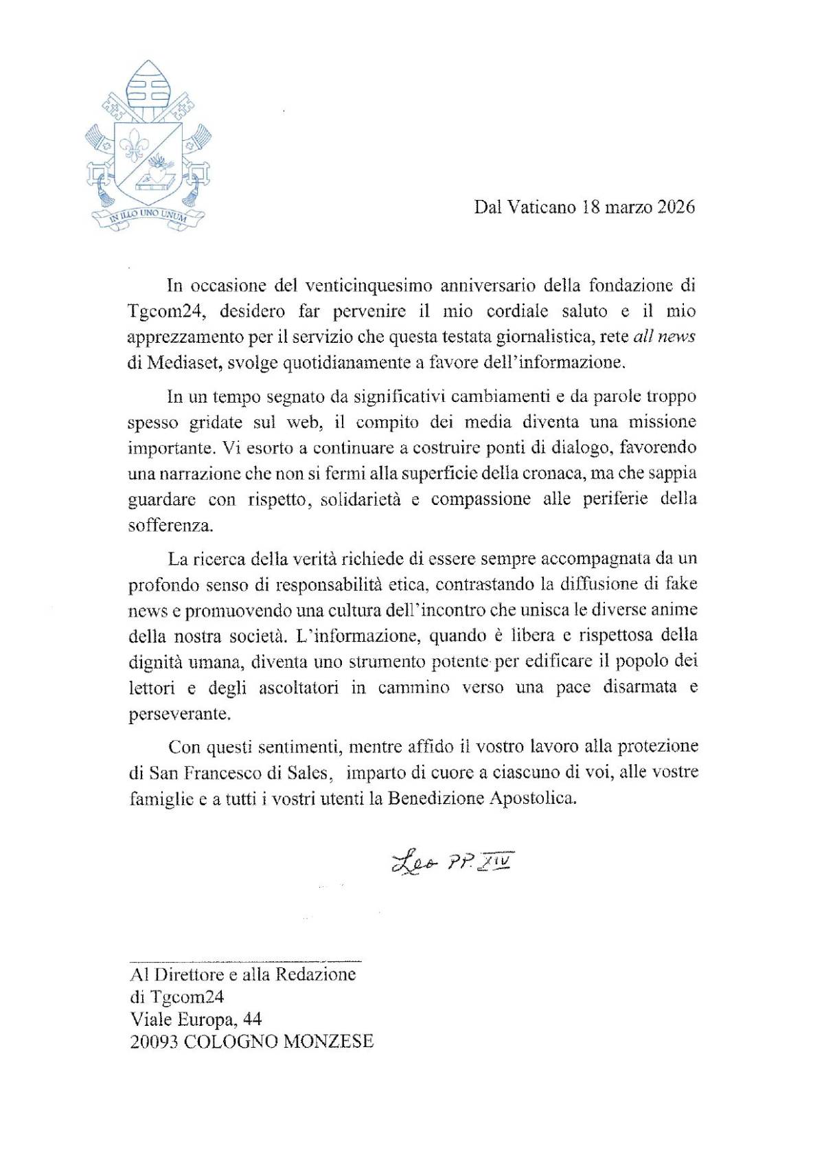 “La ricerca della verità richiede di essere sempre accompagnata da un profondo senso di responsabilità etica, contrastando la diffusione di fake news e promuovendo una cultura dell’incontro che unisca le diverse anime della nostra società" le parole del Pontefice