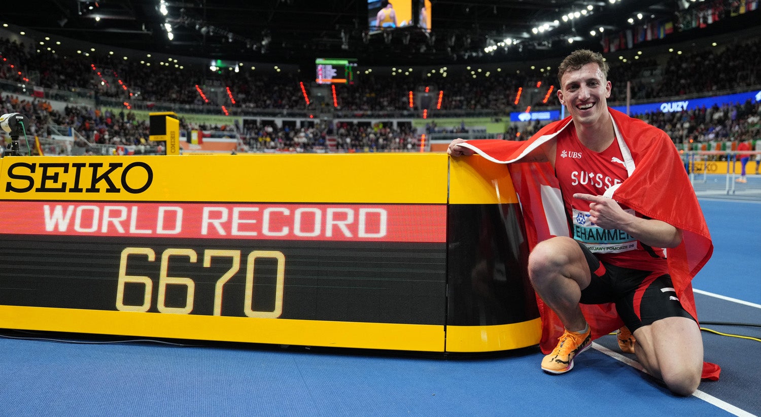 O suíço Simon Ehammer bateu o recorde do mundo do heptatlo, melhorando a marca para 6.670 pontos, para arrebatar, em Torun, na Polónia, o seu segundo título em Mundiais de atletismo em pista curta.