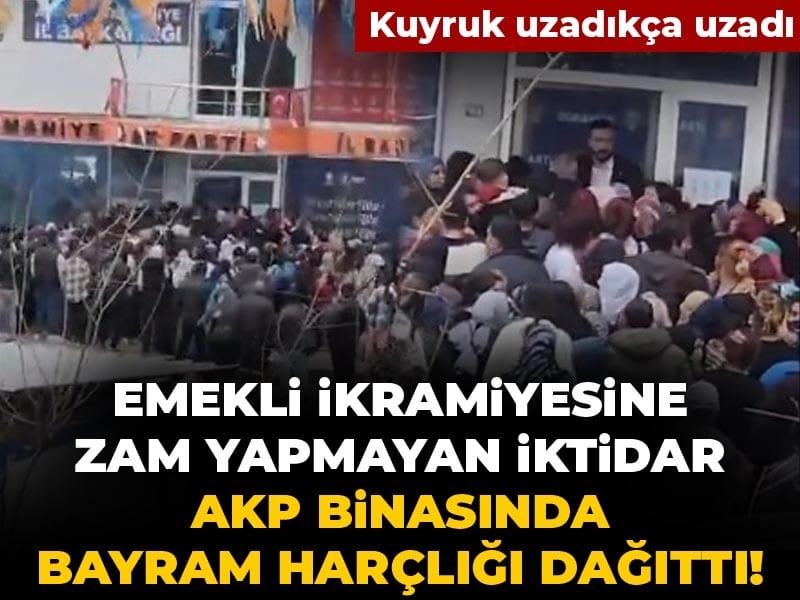 AKP, bayram ikramiyesini bu yıl da 4 bin lira olarak sabitledi. Emekli bayram ikramiyesinden umduğunu bulamazken İYİ Parti’li Turhan Çömez, sosyal medya hesabından dikkat çeken bir video paylaştı. AKP Osmaniye İl Başkanlığı’ndaki uzun kuyrukları paylaşan Çömez, “Emekliye ikramiye yok, parti binalarında harçlık mı dağıtılıyor?” diye sordu.