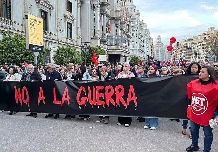 Una manifestación convocada por partidos de izquierda, sindicatos y organizaciones sociales recorre el centro de la ciudad para mostrar su rechazo a los conflictos bélicos activos en el mundo