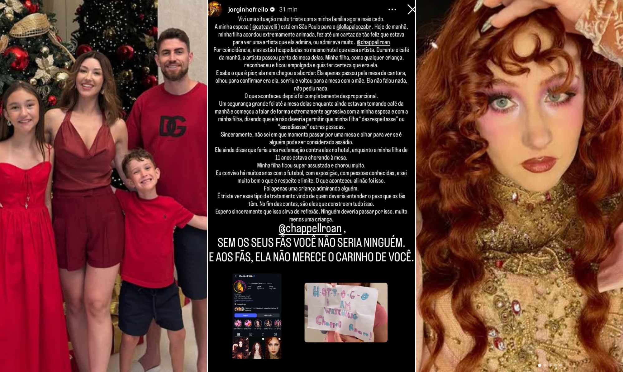 O jogador do Flamengo Jorge Luiz Frello Filho, o Jorginho, criticou, neste sábado, a conduta de um segurança da cantora americana Chappell Roan após um episódio ocorrido em um hotel em São Paulo. Segundo o atleta, sua filha, Ada Law, de 11 anos, foi abordada de forma considerada por ele agressiva pela equipe da artista após reconhecê-la no restaurante do local. De acordo com Jorginho, a jovem estava no restaurante do hotel com a mãe, a cantora irlandesa Catherine Harding, quando percebeu a presença da artista, que está no Brasil para se apresentar no Lollapalooza. Segundo o relato do jogador, a menina passou pela mesa da cantora sem abordá-la e seguiu até onde estava a mãe para tomar café. Em seguida, um segurança teria se aproximado das duas pedindo mais respeito à artista, em uma abordagem descrita pelo atleta como “extremamente agressiva”. Jorginho afirmou não compreender a reação diante de uma situação que, em sua avaliação, foi apenas uma atitude espontânea de uma criança ao reconhecer uma figura pública. “Sinceramente, não sei em que momento passar por uma mesa e olhar para ver se é alguém é considerado assédio”, escreveu o jogador. Ele também disse que o segurança mencionou a possibilidade de registrar uma reclamação no hotel sobre o comportamento da menina. Segundo o atleta, a filha ficou abalada após o episódio. Embora Jorginho trate Ada como sua filha, a jovem tem como pai biológico o ator britânico Jude Law, com quem Catherine Harding — também conhecida como Cat Cavelli — teve um relacionamento por cerca de sete meses entre 2014 e 2015. A cantora Chappell Roan se apresenta neste sábado no Lollapalooza, em São Paulo. A artista já declarou em outras ocasiões que prefere estabelecer limites mais claros no contato com fãs.