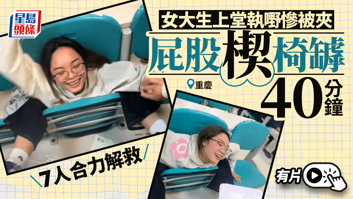 香港有乘客早前因解不開巴士安全帶受困,重慶也有女大學生上堂時,被卡在椅罅中40分鐘,導致雙腿腫脹,要7人合力才成功解救,將被困女生拔出。 據「第一眼TV」報道,重慶女大生李同學,日前在上英文課時,為了撿拾物件,彎腰時無意識一滑,屁股便滑到可上翻的椅子縫中,胸腿貼合,雙腳呈V字型舉起。 李同學企圖脫困,越是掙扎身體被椅子夾得越緊,即使旁邊同學協助,亦無法幫李同學回復正常坐姿。 最終,學校的工作人員拿