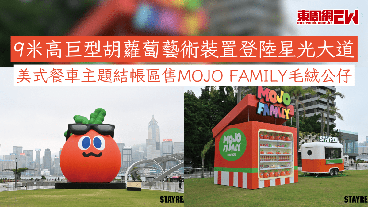 香港好去處2026|創意品牌STAYREAL正式進駐香港,並於即日至3月31日期間在尖沙咀星光大道呈獻全新藝術企劃 ——「《MOJO EXPO 星光蔔覽》」。是繼於上海東方明珠塔打造「天空蔔覽」、杭州西湖呈現「西湖蔔舟」等多個世界級地標後,品牌旗下人氣 IP「MOJO FAMILY」的核心角色「魔魔胡胡胡蘿蔔」將化身9米高的巨型胡蘿蔔藝術裝置,同場更設有可愛的美式餐車主題結帳區售賣多款MOJO F
