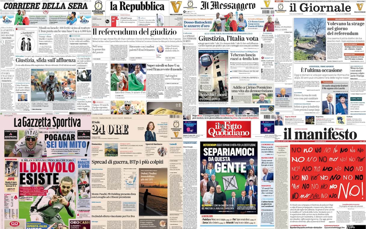 Il referendum sulla riforma della giustizia domina le aperture dei giornali. Grande risalto anche alla guerra in Medio Oriente, ai missili lanciati dall’Iran e alle conseguenze economiche del conflitto. Spazio pure allo sport, tra calcio, ciclismo e atletica