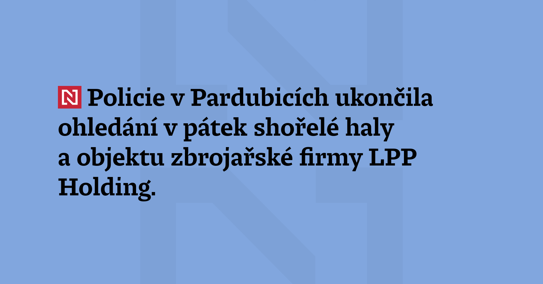 Policie ukončila v Pardubicích ohledání v pátek shořelé haly a objektu zbrojařské firmy LPP Holding. Objekt předala majiteli. Vyšetřování pokračuje. O požáru LPP Holdingu jsme psali zde. (ČTK)