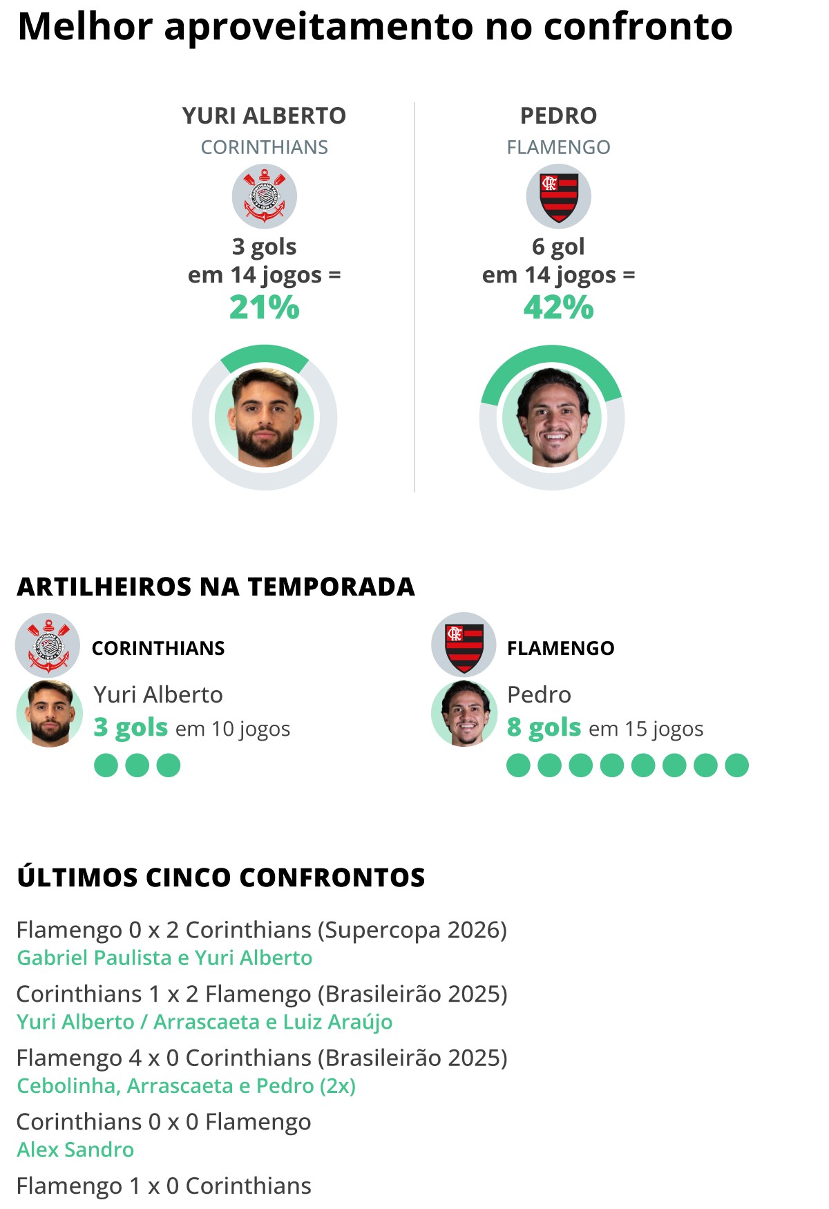 Corinthians e Flamengo se enfrentam neste domingo, às 20h30, na Neo Química Arena, pela oitava rodada do Campeonato Brasileiro. O duelo coloca frente a frente duas equipes em fases opostas: o Timão não vence há quatro jogos no Brasileiro (três empates e uma derrota) e ocupa a nona posição, com 9 pontos, enquanto o rubro-negro, quinto colocado com 13 pontos, vem de quatro vitórias consecutivas. Dentro de campo, o confronto ganha um tempero especial no embate entre os atacantes Yuri Alberto e Pedro. A pergunta que fica é: quem será o protagonista da noite? Jogadores com mais chances de marcar gol em Corinthians x Flamengo Editoria de Arte Melhor aproveitamento no confronto No histórico recente entre as equipes, Yuri Alberto é o principal nome do Corinthians, com três gols em 14 jogos (21% de aproveitamento). Já pelo Flamengo, Pedro se destaca com números superiores: seis gols em 14 partidas, atingindo 42% de aproveitamento contra o rival. Artilheiros na temporada Na atual temporada, Yuri Alberto segue como referência ofensiva do Corinthians, com três gols em 10 jogos. Do lado rubro-negro, Pedro vive fase mais produtiva e soma oito gols em 15 partidas, reforçando seu papel decisivo no ataque carioca. Últimos cinco confrontos O retrospecto recente mostra equilíbrio, mas com leve vantagem alternada entre os lados. No encontro mais recente, o Corinthians venceu o Flamengo por 2 a 0 na Supercopa de 2026, com gols de Gabriel Paulista e Yuri Alberto. Antes disso, pelo Brasileirão de 2025, o Flamengo venceu por 2 a 1, com gols de Arrascaeta e Luiz Araújo, enquanto Yuri Alberto descontou. Ainda naquela edição, o rubro-negro aplicou uma goleada por 4 a 0, com gols de Cebolinha, Arrascaeta e Pedro (duas vezes). Pela Copa do Brasil de 2024, houve um empate sem gols e uma vitória do Flamengo por 1 a 0, com gol de Alex Sandro. Com históricos recentes intensos e atacantes em evidência, o confronto promete mais um capítulo disputado entre dois dos maiores clubes do país.