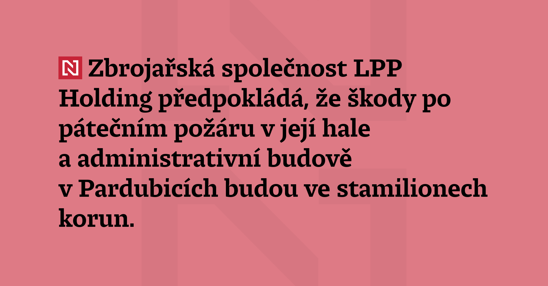 Zbrojařská společnost LPP Holding předpokládá, že škody po pátečním požáru v její hale a administrativní budově v Pardubicích budou ve stamilionech korun. Potvrdila to mluvčí firmy Martina Tauberová. Policie požár prověřuje pro podezření na teroristický útok. Pracuje se čtyřmi verzemi vzniku požáru, ve všech s podezřením na úmyslné zavinění. „Podle našich předpokladů se škody budou pohybovat v řádu stovek milionů […]