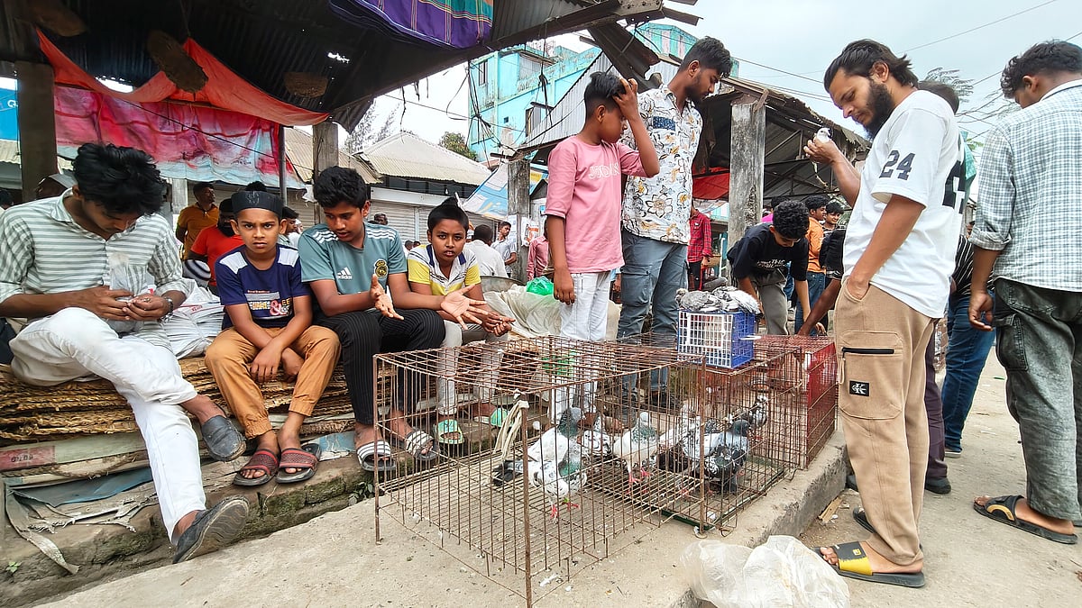 নদীর তীরে গ্রামের হাট। কবুতর বেচাকেনার জন্য এখানে দূরদূরান্তের মানুষ আসেন। শত বছর ধরে চলছে এই হাটের কার্যক্রম।