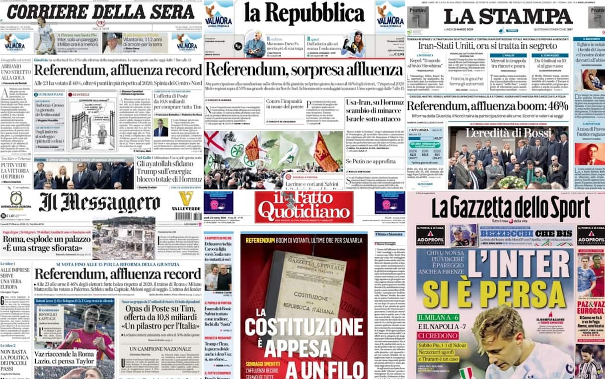 Largo spazio, sulle prime pagine dei quotidiani oggi in edicola, per l'affluenza da "record" dopo la prima giornata di votazioni per il referendum sulla giustizia. Spazio poi agli sviluppi della guerra in Medio Oriente tra Usa-Israele ed Iran, ai funerali di Umberto Bossi, alla proposta di acquisto di Tim da parte di Poste e, per lo sport, ai risultati del calcio e dello sci