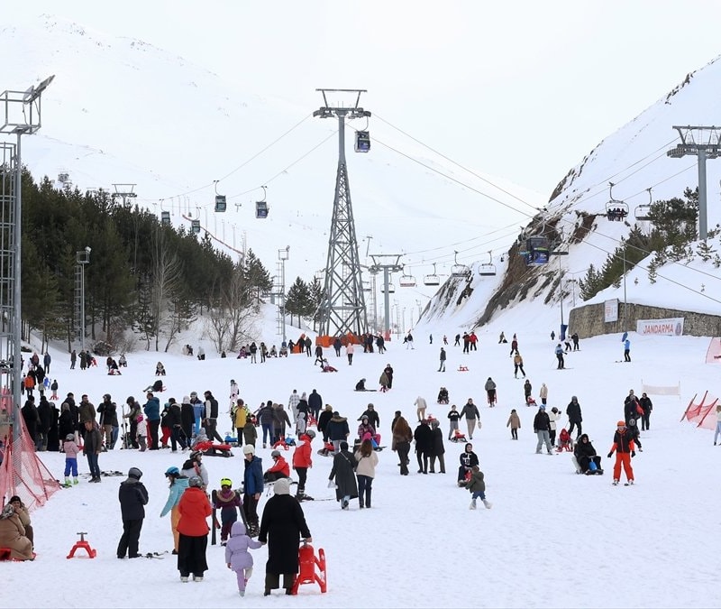 Erzurum’daki Palandöken Kayak Merkezi, bayram tatilinde 279 santimetre kar kalınlığı ve bahar havasıyla kayakseverleri ağırladı.