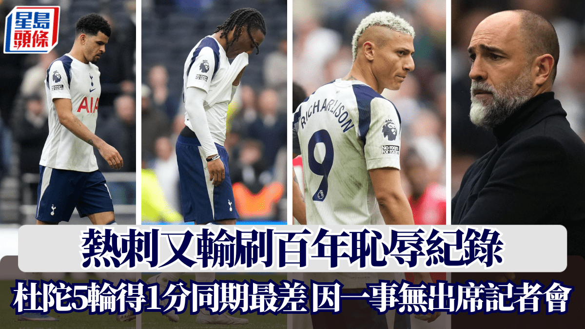 熱刺在周日英超護級大戰慘敗,主場0:3不敵諾定咸森林,被後者壓過跌落17位。這支倫敦球會已連續13場英超不勝,是隊史自1935年以來首次於頂級聯賽接連13輪都贏唔到。而主帥杜陀接手後5場英超僅得1分,是同期取分最少的英超教頭,他賽後更因為家事未能出席記者會,據報是有家人離世,受到雙重打擊。 連續13輪英超不勝 賽前排16位的熱刺對緊隨其後的森林,上演護級6分波。然而主隊未能延續過去2場各賽事1勝1