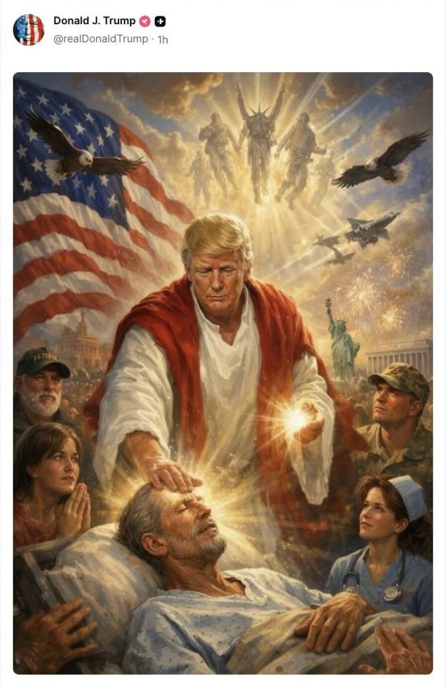 Про це пише CNN.На сторінці Трампа ввечері 12 квітня зʼявилася публікація – він в образі Ісуса Христа, який лікує хворих на фоні американського прапора, орлів та статуї Свободи. Це сталося незабаром після критики президента Штатів у бік Папи Римського, який не підтримує війну в Ірані.У понеділок пост був видалений, а при переході на його посилання зазначається: "контент більше не доступний"."Я опублікував це, і я думав, що це я як лікар, і мав відношення до Червоного Хреста", – так пояснив публікацію Трамп.Він також заявив, що лише "фейкові новини" могли придумати, що фото зображує його в образі Ісуса."Я щойно почув про це, і я сказав: "Як вони це придумали?" Це повинен бути я, як лікар, який робить людей кращими. І я роблю людей кращими", – додав глава Білого дому. фото: скріншот TruthSocialНапередодні Дональд Трамп різко розкритикував позицію Папи Римського Лева XIV щодо війни в Ірані та назвав його некомпетентним у зовнішній політиці.