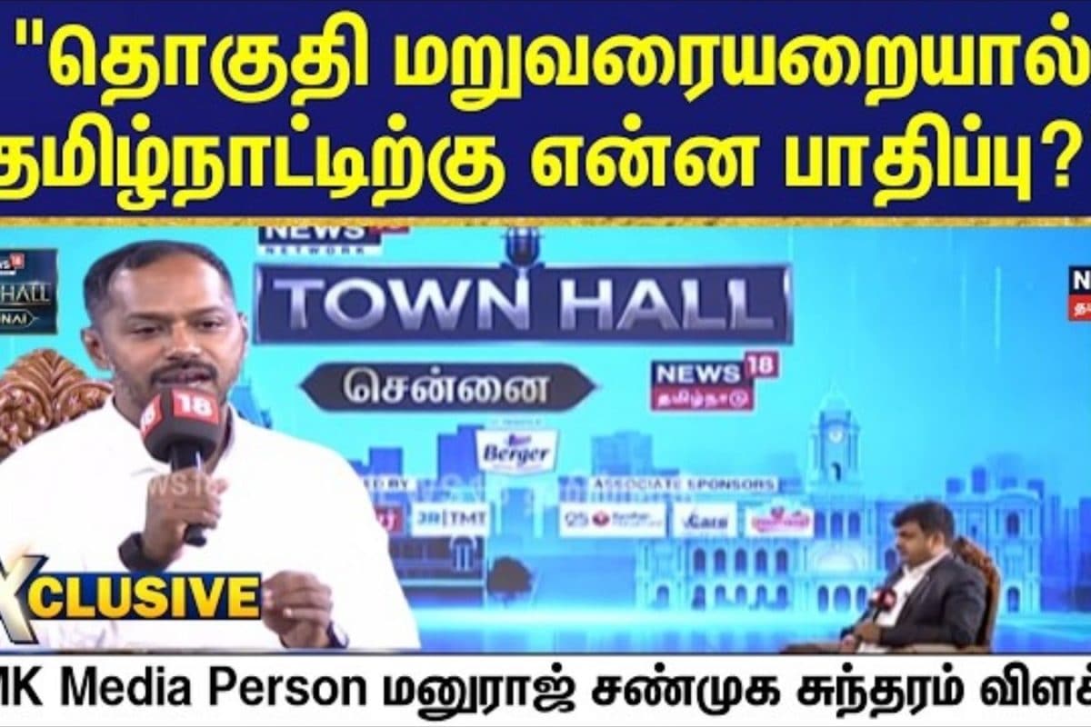 Town Hall | Delimitation | தொகுதி மறுவரையறையில் தமிழ்நாட்டிற்கு எந்தவிதமான பாதிப்பு ஏற்படலாம் என்பது குறித்து சென்னையில் நடந்த நியூஸ் 18-இன் டவுன்ஹால் நிகழ்ச்சியில் திமுகவைச்சேர்ந்த மனுராஜ் சண்முக சுந்தரம் விளக்கமளித்தார்.