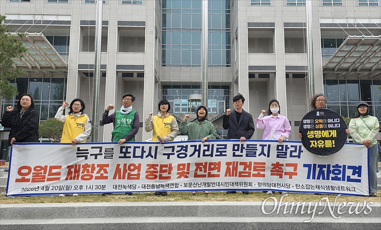 대전 오월드에서 탈출했다가 열흘 만에 생포된 늑대 '늑구' 사태를 계기로 지역 환경단체들이 동물원 운영방식 전환과 개발 중심 사업 전면 재검토를 촉구하고 나섰다. 이번 사고를 단순한 동물 탈출 사고로 치부할 게 아니라 동물을 '구경거리'로 소비하는 구조 자체를 바꿔야 한다는 문제 제기다. 대전충남녹색연합과 대전녹색당, 정의당대전시당 등 대전지역 환경단체와 진보정당 등은 20일 대전시청 북문 앞에서 기자회견을 열고 "대전시와 대전도시공사는 '늑구'를 또다시 구경거리로 만들지 마라"며 "공영동물원 운영방식 전환과 오월드 재창조 사업 전면 재검토가 우선이 되어야 한다"고 촉구했다. 이날 기자회견은 늑구의 탈출과 귀환을 계기로 오월드 운영 전반과 동물 전시 중심 관람 문화에 대한 근본적인 재검토를 촉구하기 위해 마련됐다. 특히 이들은 대전시와 대전도시공사가 재창조 사업에 대한 입장 표명 없이 늑구 관련 소식을 연일 홍보하며 흥행 분위기를 조성하는 것은 생명을 다시 '구경거리'로 소비하는 행정이라고 비판했다. 이들은 이날 발표한 기자회견문에서 "늑구 탈출 사건은 단순한 돌발 상황이 아니라 동물원의 구조적 문제의 결과"라고 지적하면서 "늑대의 생활 반경은 수백 킬로미터에 달하지만 1만 평 남짓한 사파리는 생태적 특성을 전혀 고려하지 않은 감금 시설"이라고 비판했다. 전체 내용보기