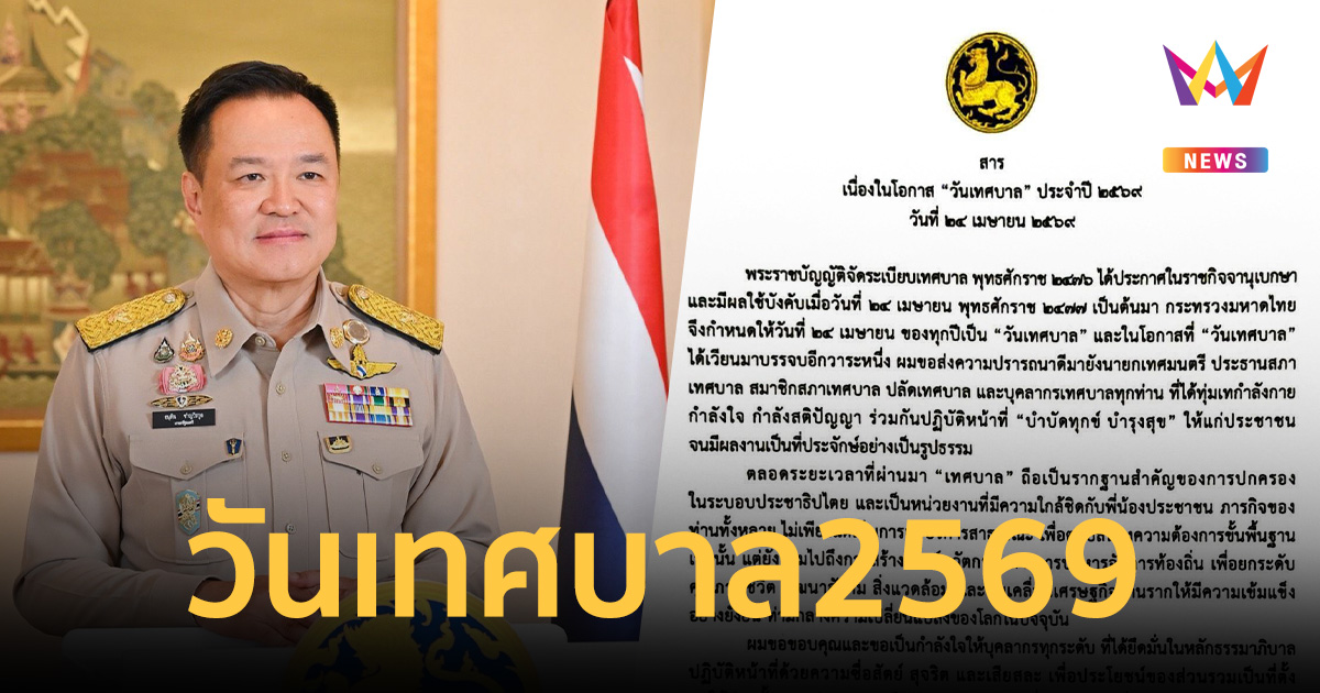 "อนุทิน" ส่งสารวันเทศบาล 2569 ย้ำเป็นรากฐานประชาธิปไตย ยกระดับท้องถิ่นด้วยนวัตกรรมและธรรมาภิบาล